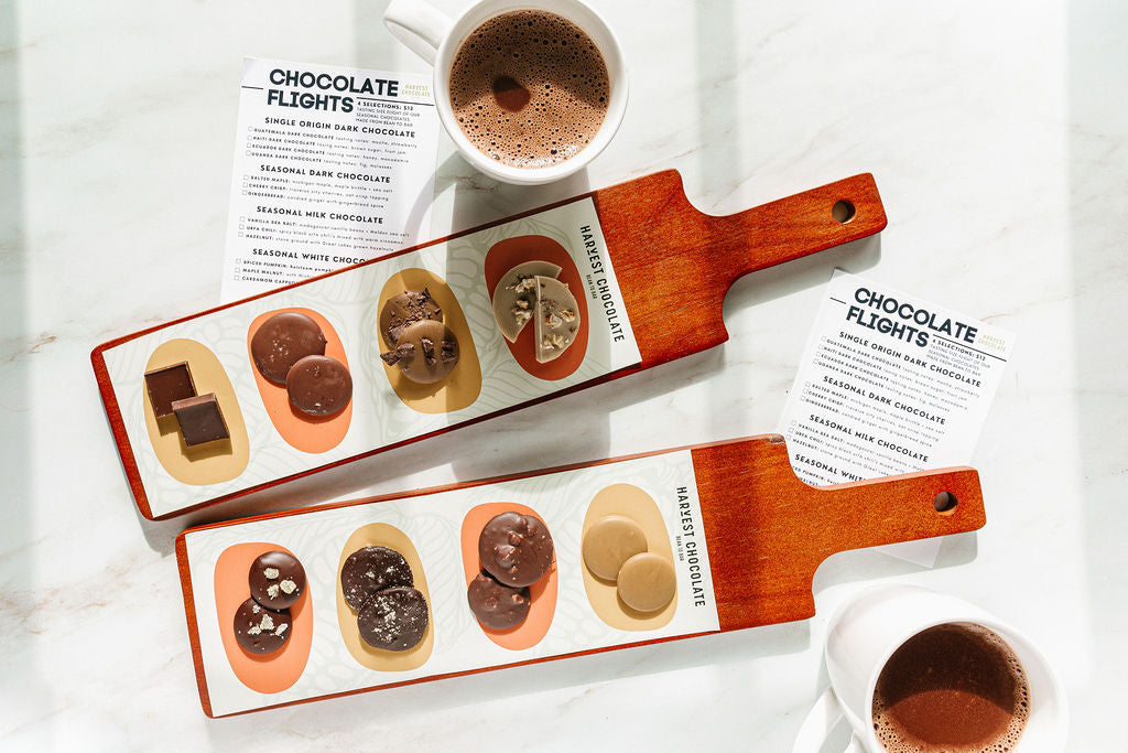 Experience chocolate made from bean to bar with your very own chocolate flight. Choose from different varieties of Single Origin Dark Chocolate, seasonally inspired dark chocolate, milk chocolate, and white chocolate, all made in house starting with the cocoa bean. Flight options rotate alongside our changing seasonal chocolate bar collection.